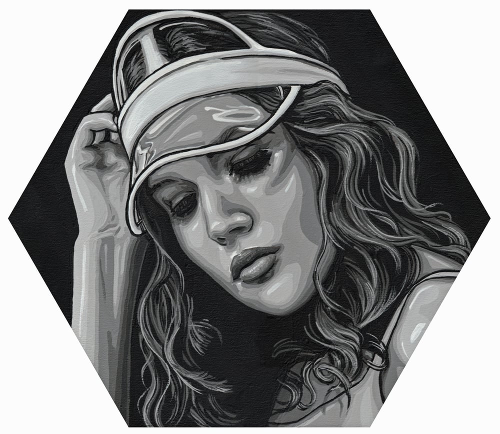 Acrylic on primed hexagonal baltic birch panel, finished in semi-gloss varnish