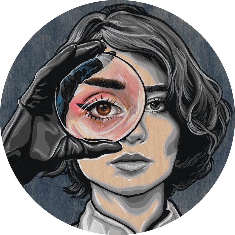Acrylic and colored pencil on circular baltic birch panel, finished in semi-gloss varnish